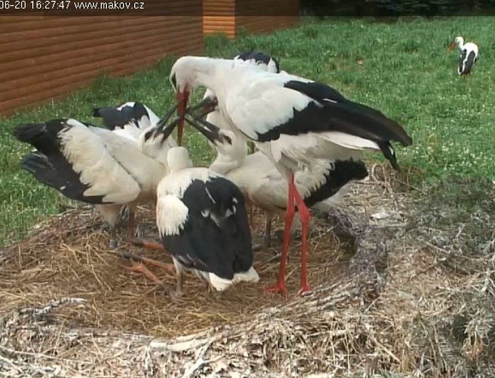 dobrý večer, přáteléviděli jste taky ty zvědavé 4 krůčky největšího čápátka mimo hnízdo? A potom nám, přímo proti kameře poslalo i " tekutý pozdrav" Těšme se, brzo nám z hnízdečka budou utíkat čím dál častěji.Všem přeji hezký večer